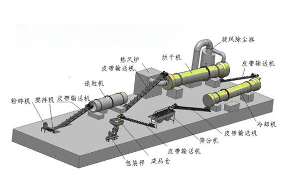 復合肥生產線的工藝流程通常可分為:原料配料、原料攪拌、原料造粒、顆粒烘干、顆粒冷卻、顆粒分級、成品包膜、成品包裝